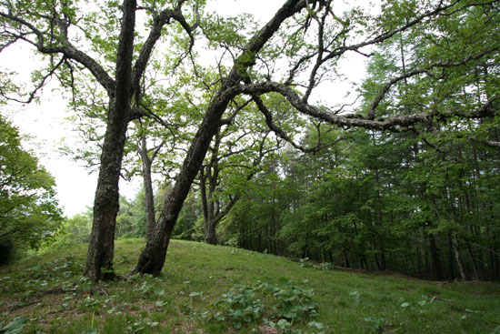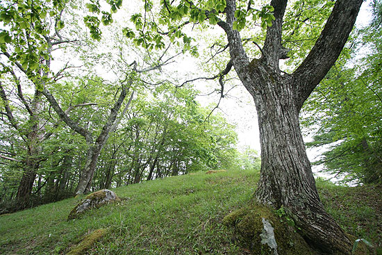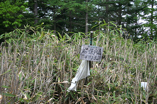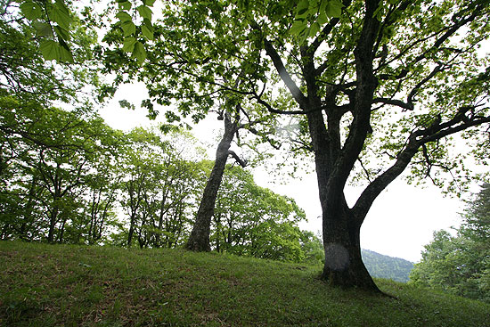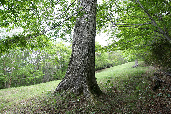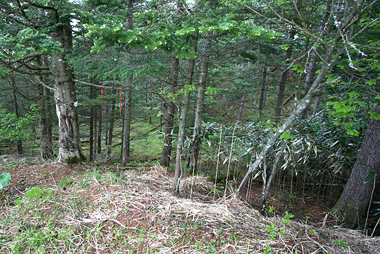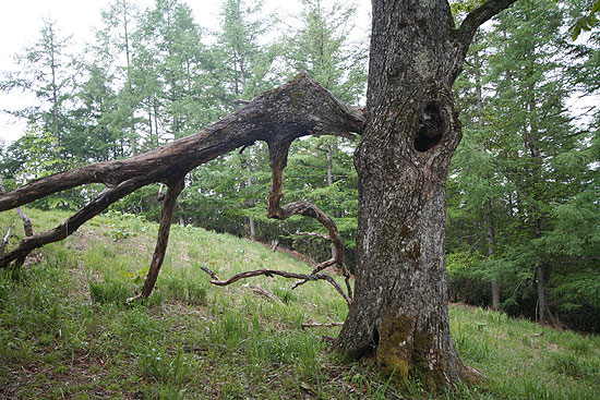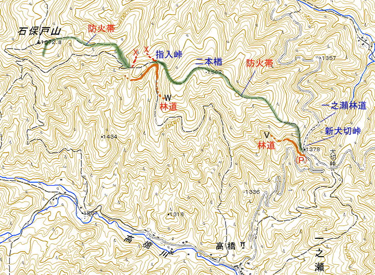 石保戸山('05-06-05歩く) 昔、山深い集落一ノ瀬から塩山の町へこの峠を越えて行ったのであろうか、主人に付いてきた犬はこの峠で別れ、 そしてここで主人の帰ってくるのをじっと待っていたのであろうか、そういう情景を想わせる犬切峠。 それに、東京都の水源の森としての豊かな森。石保戸山はいちどは登ってみたい山であった。 道標も何もない山である。数年前の 雑誌「新ハイキング」の山行記録を参考に 登る。高橋には毎年のように新緑の頃白沢峠に登っているので通いなれた道であるが、新犬切峠を通るのは1998年の将監峠・牛王院平 以来である。高橋より「一之瀬・犬切峠」方面への標識に従って右折して登って行く。何も変わったところはない。カーブのカーブミ ラーが増えたようで安心して走れる。この時期、エゾハルゼミの声を聞くたびに、今年も山に登れる幸せを感じる。期待通り、エゾハ ルゼミの鳴き声が聞こえてくる。 そんなことに浮かれた訳ではないが、新犬切峠を見過ごしてしまった。鬱蒼とした森の中に 真っ直ぐの林道に一之瀬林道の標識が立ち、もう一つの林道が右の薄暗い樹林の中に入り込んで分岐しているところが実は新犬切峠であった。 どうも、記憶が確かでないが明るいイメージがあったので、違うと思って見過ごしてしまった。 結局、笠取山の登山口作場平橋まで行って引き返してきた。 石保戸山への登り口は新犬切峠の10m位高橋よりの新しい林道が 左に分かれているその角のところである。そのあたりには車を5,6台くらいは置けるスペースがある。 以前、通ったときは石保戸山への防火帯が見えたと思ったが、7年の空白期間に木が大きくなったようで見えない。 身支度して林道の土の側壁の踏み跡を登るとぱっと開け、明瞭な道が防火帯の中を上がって行っている。 ここからは何も迷うことはない。ただただ防火帯 を登って行くだけである。この奥秩父の東京都の水源の山というか森は防火帯が多く長い。知る限りでは、先に述べた将監峠・牛王院平 にも防火帯があった。それから笠取山から在りし日の斉木林道が防火帯の役目をして白沢峠に至り、白沢峠からは斉木林道と防火帯が 三ッ窪高原あたりまで延びている。奥秩父というとシャクナゲと黒木の薄暗い樹林帯を想像するが、この水源の森の辺りはこの防火帯のおか げで明るく伸びやかな印象を受ける。 登る防火帯の上には真っ青な空があり、それに真っ白な雲が沸いてくる。 また、防火帯の縁には、今開いたばかりのみずみずしいみどりのミズナラ、カエデ、ホウノキなどの大木が点在している。また、ところどころ、 防火帯草地の中にも、カエデ、ミズナラの大木が好ましい形して立っている。今度はどんな大木が現われるか楽しみにして登る。 写真を写しながら40分ものんびりと登って行くと、標石ある標高点、二本楢に到達し、少し下りながら左に行くと、ミズナラの大木が 立ち、遥か下の指入峠を隔てて、目の前に石保戸山が見えてくる。その斜面には防火帯がやはり登っている。 左を見ると、遠くに山並みが見える。倉掛山のあたりのようである。眼下の指入峠までどれくらい降りるのか地図を調べたところ 約標高差100mである。下るのはいいが、帰りが思いやられると思いながら下る。 下ったところには林道が来ている。しかも車がとまっている。聞いた所、山菜取りのようで、新犬切峠石保戸山登り口の左側の林道を 通ってきたとのことである。よくあることではあるが、折角一山越えてきたことを思うと、少しがっくりくる。 ここで防火帯はひとまず終わりである。ミズナラの大木のそばから山道が二本林の中に入っていっている。 ここは左側の広い方に入ってゆく。左の小さな山の右を巻くように2,3分も行くと、右に山道が分岐しているところとなる。それを見送ると 直ぐ防火帯の始まりの端にでる。高橋の方に下る山道と思うが、山道が防火帯の左側外に平行してのびているが、無視してただひたすら防火帯の中 の踏み跡をたどってゆく。 海岸の松並木のような傾いた形のいい立ち木がでて来る。写真を写しながら25分も登ると、ピークに達し、 防火帯は右下に下ってゆく。そしてV溝のようなところに一旦降りて、それから急勾配の斜面を登る。5分も登ると勾配がゆるみ頭上にはウワミズ サクラが咲き、いい香りを漂わせている。 さらに10分ほど登ると地面より露出した石が散在するピークに達し、防火帯はほぼ直角に左に下っている。 このピークが地形図での石保戸山に隣接した小ピークである。この防火帯の小ピークのコーナーのあたりのカラマツ林の縁を注意してみると、 赤いテープが二本木にぶら下がっている。カラマツ林の中を覗くと踏み跡が一旦下り、向こうのピークらしきところに登って行っている。 あのピークが石保戸山であろうと見当をつけてカラマツ林に入っていく。下って登り返し右の笹の中にある道を行くと木々が丸く刈り払われた広場に出た。 そこには三角点