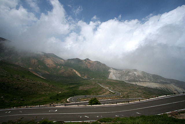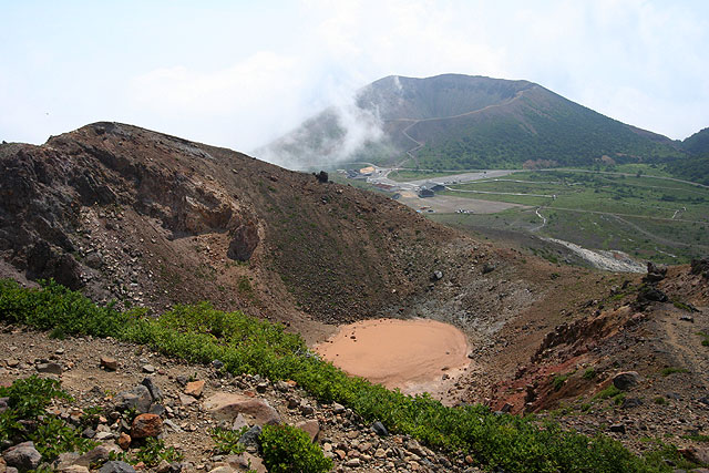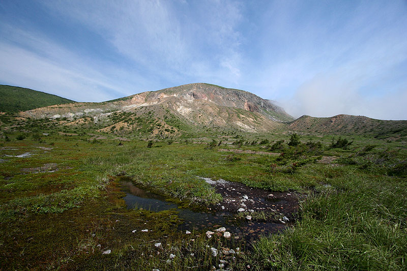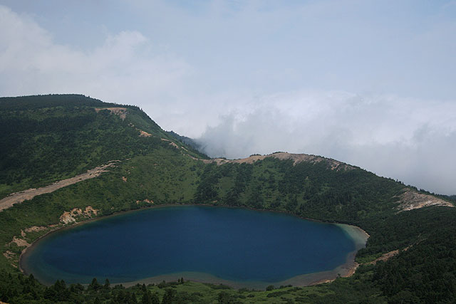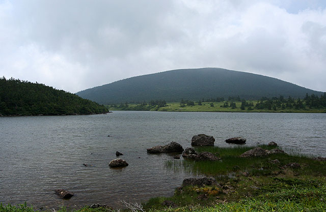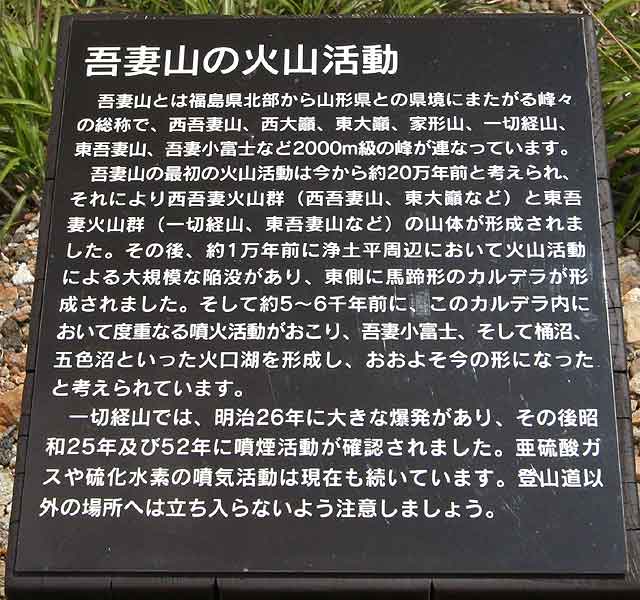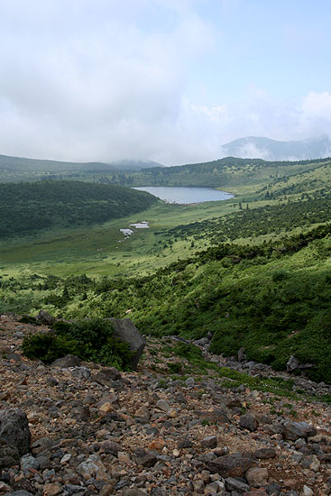 一 切 経 山 ![]() 浄土平湿原から一切経山を望む 浄土平から一切経山・鎌池('05-08-03歩く) 前日は磐梯山に登り、郡山市の磐梯熱海に宿泊した。浄土平には母成グリーンラインと磐梯吾妻スカイラインを通って上がることにする。 ホテルの朝食は7:00からであった。今日中には家に戻らなければならないので、時間を節約するために、荷物を朝食の前に車に積み込み 山歩きの準備をして朝食をとり、すぐ出発する。磐越道・磐梯熱海IC入口の前の道路を北に向って進む。空は雲が厚い。 母成グリーンラインに入ると雨がポツリポツリ落ちてくる。標高が上るに従って霧が濃くなってくる。時々、車道の両側の深緑の 樹林に映えるノリウツギの花が霧に煙り実に美しい。 母成グリーンラインは母成峠でピークに達し、中ノ沢温泉めがけて牧場を突っ切って 下っていく。下るに従って幾分明るくなってきてホッとする。115号線に突き当たり右に登坂追越し車線のある国道を登って行く。 ここから磐梯吾妻スカイラインに出るのがややこしい。兎に角、横向温泉方向と磐梯吾妻スカイラインの標識を目印にしてゆく。 その標識に導かれてややこしく曲がって横向温泉街にでる。こじんまりした温泉街であるが、ホテルがあり、結構、観光バスも止まっ ており、賑わっているようである。ここを過ぎると道は一気にスカイラインの入口である土湯峠目指してくねくねと上って行く。標高が高く なるに従ってガスってくる。右、福島、左、磐梯吾妻スカイラインの標識のあるところに突き当たり、左折するとすぐ料金所となる。 笹の原にダケカンバの林立する斜面の開けた道を登って行く。 普段の行いがいいのだろうか、へヤピンカーブを二箇所 ほど通過して、スカイラインが平坦になると雲やガスがどんどん切れてきて青空が見えてくる。やがて、兎平駐車場を通過すると 浄土平となり、左の有料駐車場に入る。早朝のせいか、広々とした駐車場には車は10台程度しかとまっていない。閑散として、吾妻小富士、一切経山に囲まれた火山の荒涼にして明 るい浄土平の風景は、一瞬、惑星の風景を思わせる。 ビジターセンターの前に車を置き身支度して出発する。 湿原の道を南に向い、一番手前の分岐点を右に折れ、一切経山への最短のコースをとる。すぐ一切経山の火山のガレ場の道を登って行く。 後を振り返ると吾妻小富士の火口が段々姿を現してくる。それを楽しみにして上って行くと、思いがけず右手下にも火口が現われる。 火口にはそのうち涸れそうな褐色の池がある。手前の火口を前景に吾妻小富士の火口を写したりしながら登ると傾斜がゆるみ、左手斜め前方に 鎌池が光っているのが見えてくる。右のピークの左を巻くように行くと、やがて鎌池・一切経山分岐となる。 右に折れてガレ場の道を緩やかに登って行く。右のピークを巻くように越えると、また吾妻小富士が右手に大きな火口をこちらに向けて現われる。 それを眺めながらひと登りすると、大きなケルンが見えてきて、そこにお寺の幟のようなものが立っている。そしてその先に三角点と道標が 立ち、一切経山山頂となる。一切経山の目玉は眼下の吾妻の瞳とか魔女の瞳とか言われている五色沼であるが、この三角点のところからは 見えない。そのため、うっかり見ないで戻りかねない。三角点から少し北の方に向って下ってゆくと、眼下に美しい紺碧の五色沼が現われる。 この日は写真のように幸運にもクッキリと見え、五色沼を眺めながらしばし至福の時をすごす。 この後、元来た道を鎌池・一切経山分岐まで戻り、真っ直ぐ酸ガ平の避難小屋に向って下る。避難小屋の付近にはシャクナゲや白いマルバシモツケ が咲いている。避難小屋を過ぎると酸ガ平の湿原となり木道を行く。湿原にはタテヤマリンドウ、ボウフウ、キンコウカなどが咲いている。 すぐ浄土平駐車場・鎌池分岐の丁字路となって鎌池の方へ右に進む。丸い周囲の山々、伸びやかで明るい湿原、真っ直ぐのびる木道、点在する 池塘、まるでミニ尾瀬のようである。 10分弱行くと鎌池が見えてくる。結構大きい池である。やさしい感じの低い丸い山々に囲まれ、 静かなたたずまいを見せている。変わる池の風景を楽しみながらぐると廻ると、道標の立つ浄土平駐車場・谷地平/東吾妻山分岐となる。 左へ引き続き池に沿った浄土平駐車場方面への道に入る。やがて池もおしまいになり、振り返っては池の風景を眺め、そろそろこの山歩きも 終わりかと惜しみながら木道を進んでゆく。 右手に優しい形の東吾妻山を見ながら行くと、木道の周りの湿原がチングルマの綿毛で一面に覆われている。姥ケ原というところ らしいが見事である。やがて、今にでも倒れそうな古い姥ケ原の看板が立つ分岐点となる( 山と高原地図に記載されている 姥ケ原の分岐点とは違う。あまり道はよくないようであるが、右に行くと地図の姥ケ原の分岐点のようだ )。 我々は浄土平駐車場へ左斜めに緩やかに下って