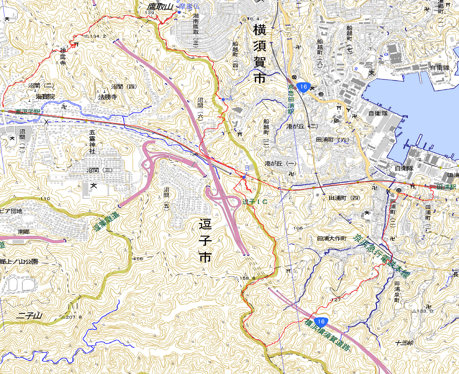 ・東逗子8:45---神武寺参道入口8:51---神武寺薬師堂9:23〜40---鷹取山10:23---追浜・田浦分岐10:34---摩崖仏10:41---追浜・田浦分岐10:50---住宅街T字路11:23---横須賀市水道局11:46---