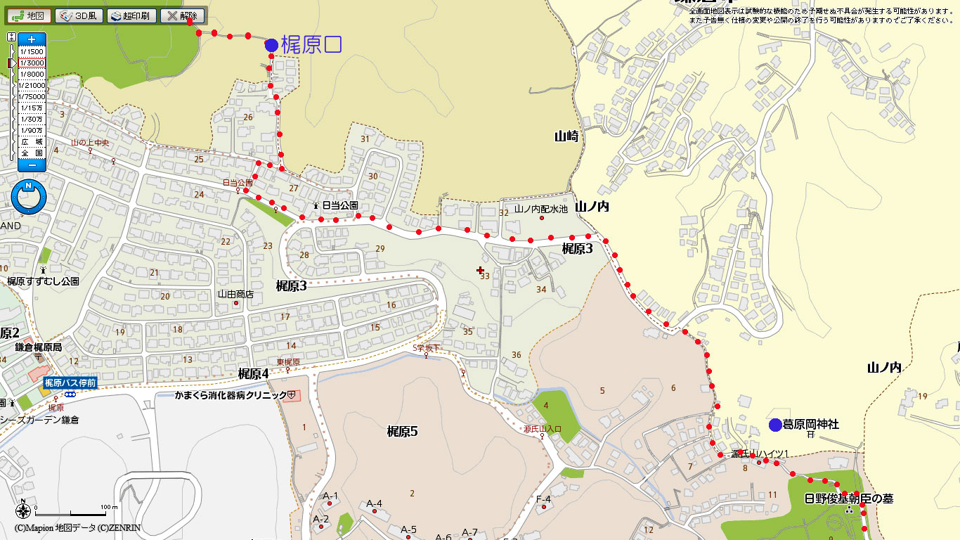 ・葛原岡神社から鎌倉中央公園へのマップ