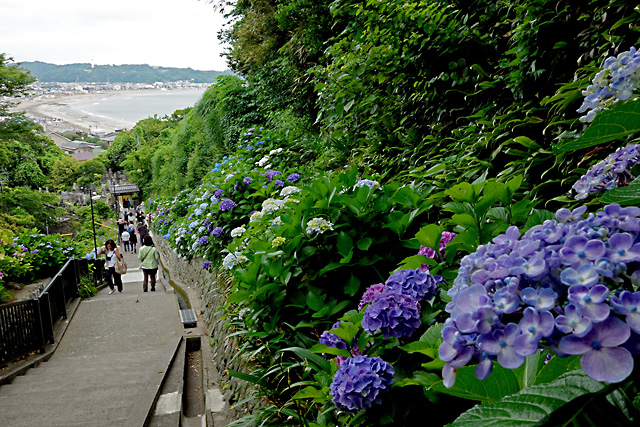 素通りして、反対側の下り石段に向かう。ここが紫陽花の咲く石段の先に海が見えるビューポイントである(上の写真)。紫陽花を写しながら下り、車道に出て極楽寺の方に