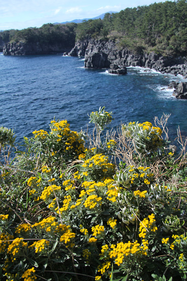 左側の入江には黄色いツワブキが咲き、荒々しい岩壁に彩りを添えている。