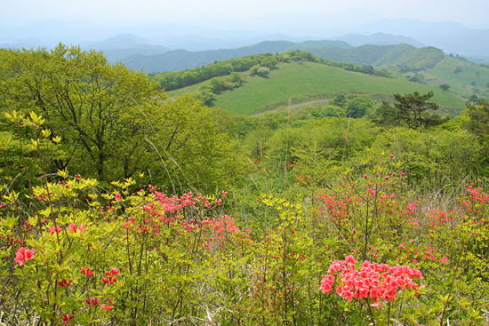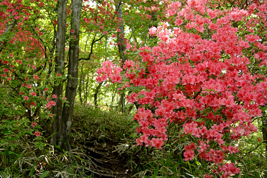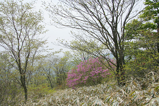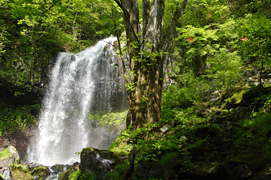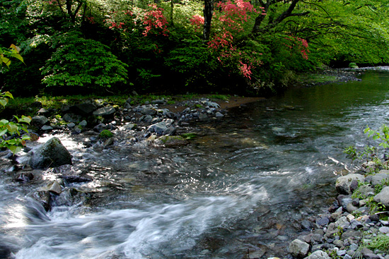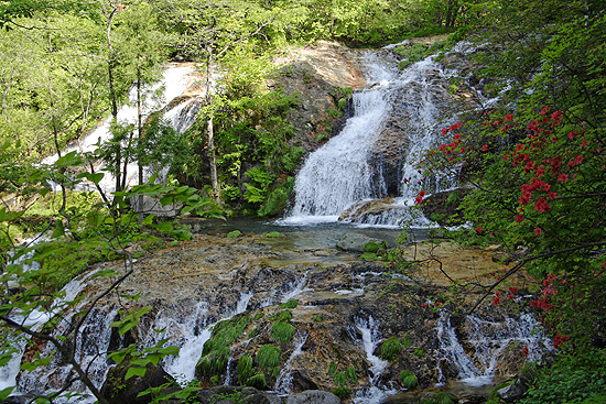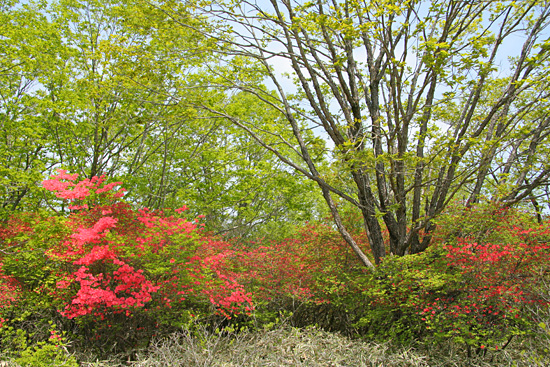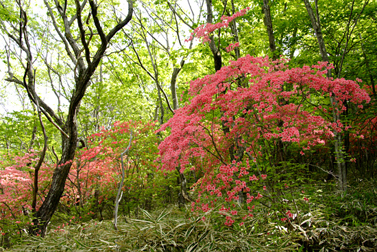 | 霧降の滝入口から大山・霧降高原('08-05-22) 日光から霧降高原・大笹牧場への有料道路(現在は無料)は何回となく通っている。その途中のつつじケ丘の ヤマツツジの群生が気になっていた。インターネットでヤマツツジの咲き具合を調べると、つつじケ丘は少し過ぎているような気がしたが、霧降高原から下ってくればどこかで ツツジと出会うだろうと、車を霧降の滝に置いて、バスで霧降高原まで上がり、大山を経て下ってみることにする。 しかし、それではあまりにも楽過ぎるので、丸山往復も加える、と言うのが当初の計画であった。 霧降の滝入口へ行く車道の両側はヤマツツジが続く。日当たりのいいところはもう終わりかけている。しかし、よく見ると、森の中や木蔭のヤマツツジは 今が満開である。今日はヤマツツジを満喫できそうだとはやる気持で霧降の滝入口駐車場に着いてみると、計画より早く家を出たこと、高速が順調だったことから、霧降高原行き始発バスまで二時間もある。 待っていようかとも思ったが、時間がもったいない、大山を経て霧降高原まで登り、バスで戻ってくる逆コースに急遽変更した。ずっと登りなので丸山はパスすることにした。 霧降の滝入口の店は閉まり、その前の駐車場は軽トラ一台で閑散としている。朝の柔らかな光に輝く新緑と点在する真っ赤なヤマツツジのコントラストがすばらしい。 それに小鳥がさえずり、バスはないが朝早く来れたことの幸せを感じる。そんな中、身支度して出発する。 ツツジの潅木の原の広い道を行く。すぐハイキングコースの案内板の立つ「つつじケ丘」になる。この辺は日当たりがいいのでほとんどのヤマツツジは 終わりかけている。 ここより雑木林にヤマツツジの点在する山道を行く。木蔭のヤマツツジの花は健在で、愛でながら進んでゆく。しばらく行くと登って行くのかと 思ったところ左にUターンしながら段差の大きい丸太の土止めの階段を下ってゆく。やがて霧降川に降りたつ。 手前に支流があり、それを石伝いにわたり中洲に行く。そこからのヤマツツジ咲く渓流の風景がすばらしい。何枚か写真を写し対岸に向おうとしたところ、丸太橋が流され、 渡ることが出来ない。そういえば前々日台風並の低気圧が通過した。それで増水したらしい。流れが弱くしかも浅く適当な飛び石のあるところがないかと、探しながら上流に進んでゆく。登山靴を履いたまま渡れるところは無い。意を決して裸足になって徒渉 することにする。 一部深いところで25cm位はあっただろうか、それに結構強い流れでもあったが、それよりも堪えたのはその水の切れるような冷たさであった。何とか渡りきり、対岸の丸太橋のあったところに看板が立っていたのが見えるので、 何が書いているか行って見る。そうすると「増水で渡れない場合はマツクラ滝の方に行って橋を渡りつつじケ丘に向かうこと」というようなことが略図で示されている。大山から下ってきた人向けの案内である。我々のように登る人向けにはそういうものは無い。 滝の写真を写してから登ることにして霧降川の上流の方へ杉の植林地の山道を川に沿って緩やかに登って行く。 渓流の瀬音が心地よい。途中、丁字の滝への霧降川にかかる丸太橋も流されていおり、丁字の滝の見物をパスして先に行く。やがて東屋が見えてきて、眼下に玉簾の滝が見える。 案内板には水が少ないと簾のような滝になるとあるが、今日はヤマツツジが彩りを添える水量の多い豪快な滝である。 この後、ヤマツツジ咲く自然林の道を急登するとマックラ滝、猫の平分岐となる。ザックを置いてマックラ滝を見に行くことにする。僅かに下ると、思いがけず林道に出る。 そして左に霧降川に掛かる橋がある。さっきの丸太橋流失時の案内はここのことを言っているらしいことが分かった。マックラ滝の道標に従って林道を突っ切って霧降川の河原に行くと、やはりマックラ滝への丸太橋があって、かろうじて曲がった形で掛かっている。 それを渡り、枝沢に沿って行くと、落差が30m位あるだろうかすごい水量の豪快な滝が見えてくる。滝の飛沫を浴びながら滝つぼ近くまで行って写真を写す。 マックラ滝、猫の平分岐からいよいよ大山への登りとなる。金属製階段で牧柵を越える。と言っても越えたところは牧場らしくないヤマツツジ咲く雑木林の斜面である。これは以前の牧場の境界の牧柵ではないかと思う。この雑木林の登りは燃えるようなヤマツツジのトンネルである。雑木林の潅木として ヤマツツジが咲いているので開放感はないが、その群落のすばらしさには感動した。あらためてヤマツツジは日陰に強い木なんだと思う。結構、急斜面であえぎあえぎ登る。 燃えるような真っ赤なヤマツツジから元気をもらいながら30分ほど登ると、今度は牧草地の開放的な牧場、すなわち霧降牧場に金属製階段で牧柵を越えて入る。 ここから右の牧柵沿いに登って行く。左後方の眼下はるか向こうには男体山