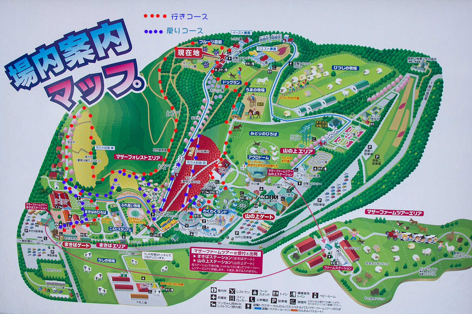 マザー牧場は源流に近い谷を挟んで東西に「花の大斜面」という地形で、東側斜面上が「まきばゲート」、西側斜面上が展望館のある「山の上ゲート」