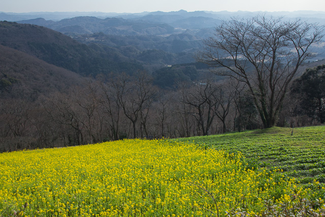 3Fの展望レストランで展望を楽しみながら昼食をとる。眼下の菜の花の斜面や水仙畑の先にまきばゲート付近の施設、鹿野山の鹿野山ビューホテル、