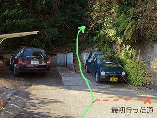 北鎌駅へどう行くか、海蔵寺から少し戻って、右折して 化粧坂切通しを通って葛原ケ岡ハイキングコースを浄智寺に戻ることも考えましたが、遠 廻りなので、化粧坂切通しへの交差点のほんの5,6m手前の交差点を左に曲がり、葛原ケ岡ハイキング コース入口付近に達するショートカットコースを地図を見て選びました。 しばらく舗装の道を登って行くと山の斜面の下に辿りつきました。そこからは斜面を右にジグサグと 急登して行きました。ところが予想に反して、最後は邸宅の門の前で行き止まりになりました。 間違えたかと思い下って民家の人に尋ねたところ、斜面下の車が2台ほど駐車していたところにある 狭い階段が登り口とのことでした。左の写真の通り、道の登り口は本当に分かりにいです。道も鬱蒼とした林の 中を急登している山道でした。5分くらい登るとひょこり、見覚えのあるハイキングコースに出ました。 |