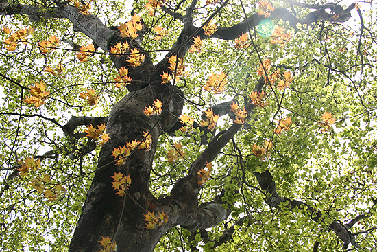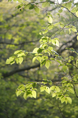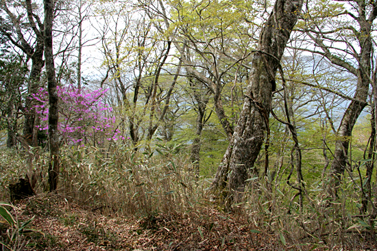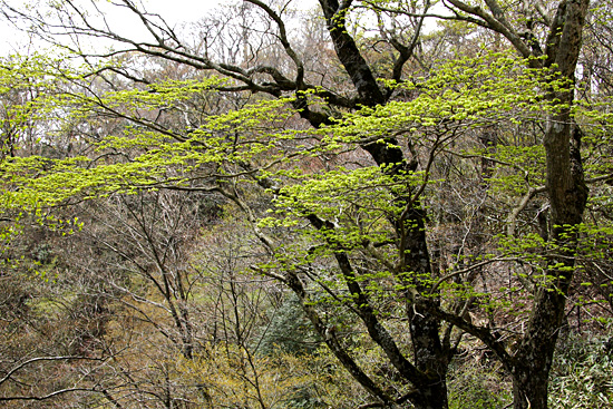 | 道志の湯の先(P)〜加入道山〜白石峠〜バン木ノ頭〜横浜野外センター〜(P) と歩く ('08-05-01) 昨年の秋、横浜野外センターを基点に、浦安峠〜大界木山〜畦ケ丸〜バン木ノ頭〜横浜野外センターと周回した。 このとき、バン木ノ頭の北東方向の加入道山に至る尾根が気になり、もうそろそろブナの芽吹き始める頃だろうと、道志の湯の先の駐車場を基点に上のコースで歩いてみた。 道志の湯を過ぎ、少し行くと、Y字分岐となり、 左側に上っている車道の入口に加入道山・大室山登山口の看板が立っている。 案内に従って左に入るとすぐ右側に二箇所ほど広い駐車場がある。そして、すぐ先が加入道山・大室山登山口である。今回の周回コースは 横浜野外センターとこの駐車場間が1時間ほどの林道歩きである。どちらから廻るか思案する。最初に高いところに登って、後はルンルンと下ると言うことにして、先の加入道山・大室山登山口に向う。 道志村は横浜市水道局の水源地になっている。横浜市の各区が分担して植林したようで、区の標識が立つ若木の植林地を緩やかに登って行く。そのうち太い赤松の混じる自然林の沢沿いの 遊歩道のような山道を緩やかに登ってゆく。朝の斜光に若葉の新緑がまぶしく映え、身も心も緑のシャワーに染まる。これだけでも来た甲斐あったと幸せな気持になる。 約40分ほど行くと、東屋のあるところに達し、沢とも別れ、そこから本格的な登りとなり、加入道山から派生している枝尾根に乗る。 時々、尾根筋を横断して廻りこむようなフラット道となり、適当に息抜きさせてくれるいい道である。東屋から1時間弱登ると珍しく杉林となり、それを抜けると前方に大きな尾根が迫ってきて、沢の源流部分を渡り、それから ジグザクと尾根に向って上りながら高度を稼ぐ。大岩の脇の丸太階段を登りきると、やがて加入道山と白石峠の間の尾根に躍り出る。 まずは加入道山へ左に行く。ブナ林の美しい道である。 もう芽吹いているのではないかと期待して来たがまだ冬枯れであった。新緑の頃、いいだろうなぁ〜と思いながら写真を写し写し行く。 山頂にはテーブルがあり、黄色くなり始めたダンコウバイを眺めながらしばらく休憩した。 結構、白石峠の方、大室山の方から登ってくるが、ほとんど西丹沢自然教室を基点とした周回のようだった。 先が長い、適当に休息を切り上げて白石峠の方に出発する。トウゴクミツバツツジであろうか、まだ芽吹いていないがツツジが結構多い。 ツツジの咲くブナ林、その頃また来たいものだと思いながら下る。白石峠までは登山者と会うが、その先に行く人はいないようで 連れとの静かな未知の山道を進んでゆく。 この尾根の東南斜面は鹿の食害防止のネット工事が進められている。 ネットの無いところと有るところの笹や下草の生育状況差は明瞭で、その食害のひどさを再認識したが、丹沢の山々の尾根は将来ほとんどがこのような金網フエンス風景に なってしまうのだろうか。 バン木ノ頭まで続く尾根は小さなピークのアップダウンの繰り返しで、特徴が無く、どこまで歩いてきているのか分からない。 しかし、標高が1200m位いまで下がったために、冬枯れのブナの中に、日差しを受けて、一斉に葉っぱを展開し新緑が黄金色のように輝くブナの大木、今、展葉したばかりの黄緑の葉っぱをひらひらさせているブナ、など目を楽しませてくれる。 それにマメザクラも残っている。後半になるとミツバツツジも現れ、緑の中に彩りを添える。白石峠から1時間余も歩くと、右前方に、右に下っている一部黒木の林立する尾根が見えてくる。 昨年歩いたバン木ノ頭から野外センターへの尾根は栂の大木の原生林があった。あの黒木はあの栂に違いないと思う。 やがて一つの顕著なピークに達し今までにないほど急降下する。そして鞍部に達し、急登すると見覚えのあるバン木ノ頭であった。 ここで遅い昼食を取り野外センターへと出発する。バン木ノ頭から野外センターの尾根は岩混じりの尾根のためであろうか、下りはじめたとたんミツバツツジの群生が歓迎してくれる。秋は栂の暗い原生林にネオンのように木漏れ日に輝く黄色や赤のモミジを堪能した。 今回はどんな風景が待っているだろうとわくわくする。 最初はブナの大木に寄り添うミツバツツジである。いよいよ栂の原生林になると、 こんなに暗いのにミツバツツジが育つだろうかと疑っていたが、まるで暗がりを照らす灯火のようにアチコチに点在している。写真を写しながら45分も下ると栂の原生林も終わり、やがて杉林を抜け野外センターに着く。 ここからは林道を下る。見るべきものは何もない。ただただ黙々と足を前に運んで進む作業をするだけである。 約1時間弱下ると、道志の名所「的様」に着く。渓流の岩が的のような模様になっているだけであるので前回は見なかったが、今回はくたびれたので、休みを兼ねて見物することにする。 どうして、どうして、的だけでなく