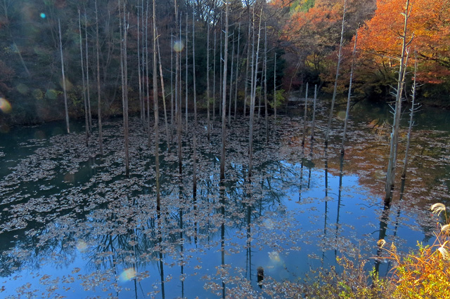 池は大田切池(map-E)で、池の中に杉の枯木立が林立し、まるでこじんまりした大正池のようである(上の写真)。葉っぱが浮き、クヌギであろうか、
