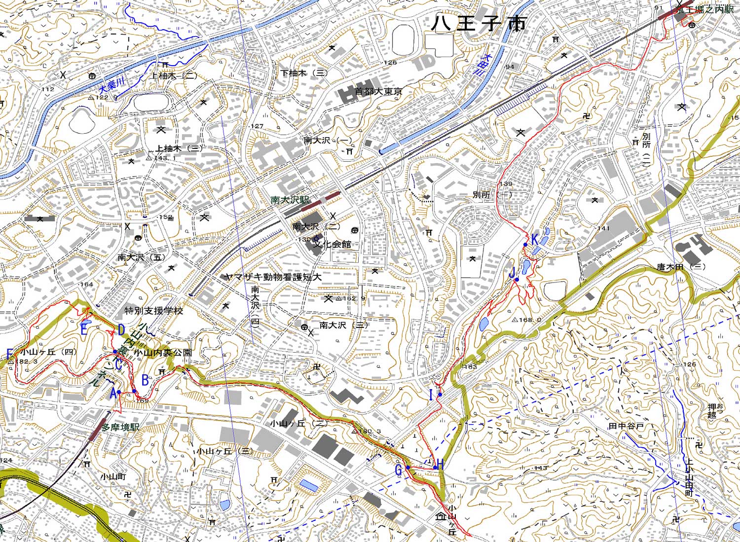 蓄池遊歩道入口(map-J)12:13〜16---芝生広場12:44---堀之内駅13:25