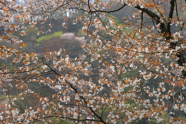 木々が開けて、山桜にちりばめられた華厳山の斜面が目の前に展開した。それはまさにフィナーレにふさわしい山笑う風景で、思う存分写真を写した。