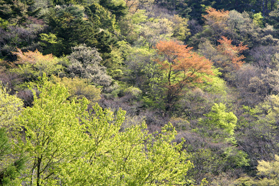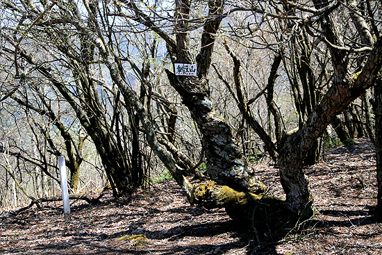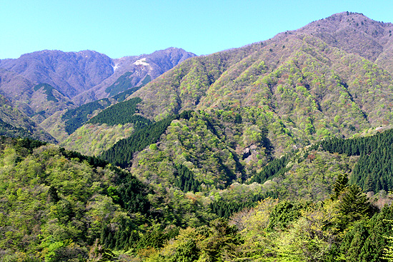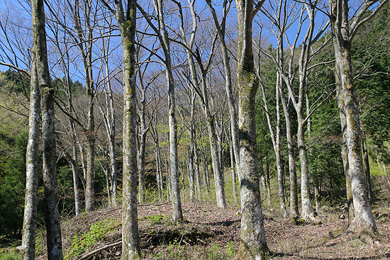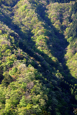 | 奥野林道から黍殻山 ('07-04-29) GWの真っ只中、明日は天気がいい、どこか出かけたい気分となる。高速道路は渋滞するので、近場で新緑の中を散歩するところ ないかと考える。そういえば、4/中旬二回ほど早戸川の芽吹きや山桜の写真を写しに行った時、北側の尾根の上にガードレール が見えた。あそこから早戸川の新緑を眺めるのもいいかもしれないと行ってみることにする。 あのガードレールは 昭文社の山と高原地図「丹沢」を見ると「松茸山自然公園」の北側の水沢橋から馬の背・大平と尾根の中腹に沿って伸びている林道(奥野林道)のようである。 そして大平から東海自然歩道の黍殻山に山道がつながっている。はじめは大平あたりで引き返す予定であったが、誘惑に負けて黍殻山まで登ってしまった 。 宮ケ瀬湖の虹の大橋を過ぎて、津久井の方へ左折し、鳥屋交差点を早戸川国際マス釣場の看板に従って左折する。 道なりに行くと奥野ずい道となる。ずい道を抜けて、真っ直ぐ行くと早戸川国際マス釣場であるが、ここを右折する。5分も行くと ゲートがあり林道は通行止めとなる。ゲート付近には7,8台くらい車をおけるスペースがある。 朝、7時頃なのに、もう4,5台駐車していて、渓流釣りの人一人が準備をしている。山歩きの人間には不案内なところであるが、渓流釣りの人には良く知られた場所のようである。 林道は二つある。左上の林道を松茸山自然公園の北側沿いに上って行く。4/中旬、早戸川に写真を写しに来た時、松茸山自然公園の登り口には 「ヒルに注意」という看板があった。この辺もヒルがいる可能性があるが、林道は舗装なのでその心配はない。余り見晴らしはよくないが、林道の左崖の上の新緑に日差しが 射しまぶしく輝いている。新緑を透過していくる光りを浴びながら35分ほど上がってゆくと、松茸山自然公園の奥野口に到着する。 びっくりである、そこには区画された駐車場まである。公園を整備した当時はここまで車でこれたのかもしれない。今はゲートで交通止めとなっている。なんというちぐはぐなことだろう。 このあたりから馬の背をへて林道は結構勾配のきついところを行く。15分も登ると、左側がところどころ開けてきて、眼下の早戸川の森や本間の頭の尾根、それから蛭ケ岳の方まで 見えてくる。写真を写しながらさらに30分も行くと、今度は正面に萌黄色、黄緑などの新緑にまだ桜の残るガタクリ峰の尾根がまじかに見えてきて、身も心も新緑に染まる。 さらに、左側には澄み切った青空の下に東海自然歩道の尾根の姫次・黍殻山の連なりも展開する。それらを見ていると、むしょうに登りたくなり、登山口を探して先に行く。 しばらく行くと、まだ芽吹いていないケヤキの大木の林立するなだらかな斜面の広場にでた。急に風景が変わり、こんなところに このようなところがあるとは、と驚いた。よく見ると「かながわの美林50選 奥野大平のケヤキ林」という標識が立っている。途中で引き返していたら出合えなかった。 儲かったような気分となる。そしてほんの少し行くと右に登る道路が分岐していて「東海自然歩道 大平分岐・黍殻山方面」の道標が立っている。 東海自然歩道への 山道は奥野大平のケヤキ林の脇を登って行っている。そして杉の大木の林立している斜面をジグザクと登って行く。林間にはクロモジの木が点在し、木漏れ日 に輝く若葉は蝶が舞っているかのようである。また足元を見るとヒトリシズカがやはり木漏れ日のスポットライトに照らされ輝いている。そこまでは良かったが、杉の植林帯の 薄暗い山道が延々と1時間も続く。そして次に左が自然林の尾根らしきところを直線的に延々と登って行く。ほとんどフラットなところはなく、展望もいまいちな結構な登りである。 50分ほど登るとようやく植林帯の中の薄暗い東海自然歩道大平分岐につく。 そこを右に少し行くと、黍殻山を巻いている道と直登している道の分岐となる。 左の直登の道を登る。カラマツや潅木の見通しの効かない急斜面を登って行く。約15分ほど登って待望の黍殻山につく。 山頂は広くアブラチャンやマメザクラが咲いているが、カラマツなどの木々に囲まれて展望は何もきかない。 遅い昼食をさっと取り、もと来た道を下る。 黍殻山はどういうところなのか見に来たようなもので、もう来なくていいなぁ〜、と連れと話しながら下る。黍殻山は東海自然歩道の途中による山で、わざわざそのために登る山でないようである。 また来るなら奥野大平のケヤキ林位まででいいと思った。 (地図) ・ 昭文社 山と高原地図 「丹沢」 (コースタイム) 水沢橋(P)--(2時間)--奥野大平のケヤキ林--(2時間)--黍殻山--(1時間20分)--奥野大平のケヤキ林 --(1時間25分)--水沢橋(P) |