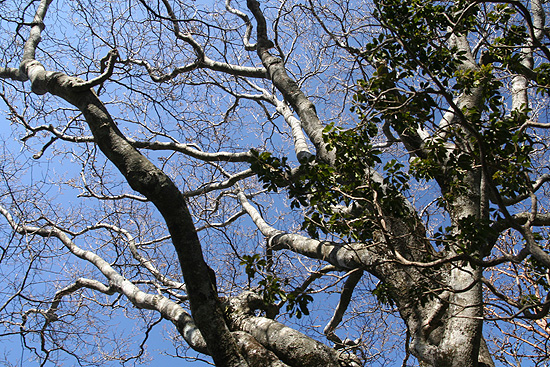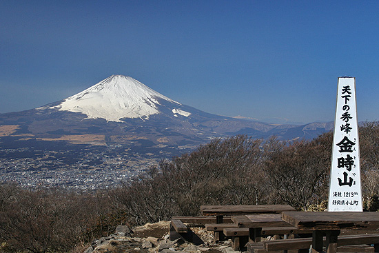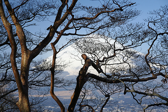 ![]() 乙女峠からの富士山 金時神社から乙女峠〜金時山(06-01-10歩く) 冬場は休養の時期として山にはあまり登らないことにしているが、富士山や樹木の写真を写 すのに、雪は少しはあって手ごろな山はないものかと、思案しているうちに、そういえば、山歩きを再開した50才頃登ったきりで、最近の様子が 分からない金時山を思い出し、訪ねてみることにした。 今回は、周回するコースとして、金時神社の駐車場に車を置いて、乙女峠・金時山 ・金時神社と歩いた。これもどちらから廻るか迷うところである。いつもの理由、帰り長々と車道を歩くのがいやで、最初に乙女峠に廻った。 歩いてわかったが、金時山から金時神社への道は分岐からはほとんどが潅木と杉林の道で見るべきものがなく、これは下り専用の道だと思えた。 そんなことで結果的には乙女峠からが正解だった。 身支度して国道135号線を上って行く。約12分ほど歩くと乙女峠入口となる。そこから 木の根が露出して張り出し、石のゴロゴロした歩きずらい杉の植林帯を登って行く。18分ほど登るとやっと植林帯から抜けて、涸沢沿いにコナラ の道をジグザクと上って行く。振り返ると梢の間から神山がシルエット状に見え、その中腹で大涌谷が白い蒸気を噴出している。 繊細なコナラの梢が青空に映えて美しい。ブナの大木も一本であるが現われ、独特の曲がりくねった枝を青空に広げている。木々の写真を 写しながら1時間ほど登ると尾根が近づき、ひょこりと富士山の見える乙女峠に飛び出す。 今日は昼頃から南の風に変わり暖かくなる、との天気予報、もしかして富士山は霞んでいるかもしれないと思ったが、若千、靄っているものの バッチリと見える。先だっては近距離の須走りで富士山を見た。それもダイナミックでよかったが、遠くから見る富士山、裾野の線が綺麗で 、やっぱり富士山は遠くから見る山かもしれないと思いながら写真を写す。 今朝はだいぶ冷え込んだ。長尾山への登りは赤土のむき出したと ころで、普段なら泥んこ状態と思うが、カチカチに凍り、道の脇や土壁にはシモバシラがびっしりとでき、歩くには都合が良い。 長尾山までは周りはずっと潅木の道である。あまりにも潅木が長いので、昔、歩いた時はブナなどあったような気がする、思い違いだったろうか、などと思いながら登る。だいぶ上がってきたようで、振り返ると芦ノ湖が見えるようになり、湖面が光っている。それから さらに登ると傾斜もゆるみ道標の立つ長尾山となる。 この辺から雪が多くなり、アセビや笹など緑が混じる形の良い潅木の気持ちのよい雪道を行く。右手には木々の間から金時山が見えてくる。その手前に 一山見え、まだまだ道のり遠い感じである。道は北の方に向いて下りだすと、突然のようにブナの大木が現われる。 左手にはブナの間から 富士山が見え、写真を写しながら下る。このブナの道がずっと鞍部まで続く。こんなに多かったのかと思うくらい続く。道は北面であることから凍結している。 登ってくる人はアイゼンを装着している。連れは雪国出身(私もそうだが・・・)、これくらいどうって言う事ないとつけないでどんどん進む。 私もつられて進む。氷でつるつるする階段も出てくる。ここら辺でアイゼン装着か、と思ったが、うまい具合に木の根っこが手すりのように張り出てい て、つかまりながら無事通過する。難なく通過するが、足元に気をつけたり、いいアングルの富士山やブナがないかと探したり、写真を写したり忙しい。 鞍部付近になって凍結も少なくなり、足元に気を配らなくて良くて助かる。やがて登りにさし掛かるが、ブナや富士山の写真を写しながら登っているうちに 、長尾山から見たときは相当登り返すように見えたが、意外にすんなり平坦なところに達した。 平坦なところはブナの大木はなくなり、アセビ、笹の混じる潅木 の気持ちのよい雪道となる。潅木の奥をよく見ると、生き生きした若いブナらしい木が多い。丹沢から箱根あたりでは若いブナはほとんど見かけなくなっただけに、 目を疑った。私の観察力もいい加減である、本物であるといいのだが、と思いながら行く。やがて右側が開けて眼下に仙石原が見渡すところに達し、そこより少し下り、金時山へ登り返す。 勾配のきつくなった山道は北面で、しかも標高が高くなり、山道の踏まれた雪が凍結している。いざとなったらいつでもアイゼン装着の覚悟で登る。左手の足柄方向 の急斜面にはブナの古木が多くなる、途中で折れているもの、立ち枯れているものも出てくる。凍結した道も、登りなのでなんとか岩や木々につかまりながら 登り、ようやく平坦なところまで登りきる。少し行くと樹林が途切れ、ガレ場の向こうに天下の秀峰・金時山の看板と山小屋が見える。さえぎるものがなく身を切るような冷たい風が強烈に 箱根側から吹き上げてくる。 帽子を手で押さえながら、一目散に山小屋のあるところまで駆け上がり、富士山