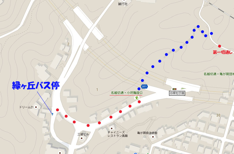 緑ケ丘で降りる。初めてのところなので、小坪口がわからない。バス停近くの人に聞いたところ、下に添付の通りであった。