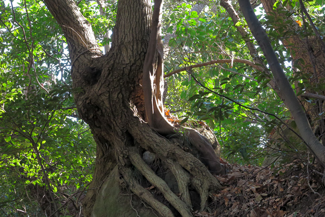 道であったのである。後は何回となく通った道、時々ミズナラやコナラ、クヌギの落葉広葉樹の混じる常緑樹の山道を行く。