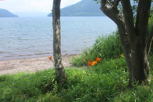 ようやく森を抜けると右に芦ノ湖が開け、カンゾウが咲き(上の写真)、湖水の風景と共に、癒される。