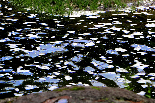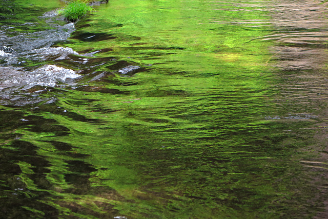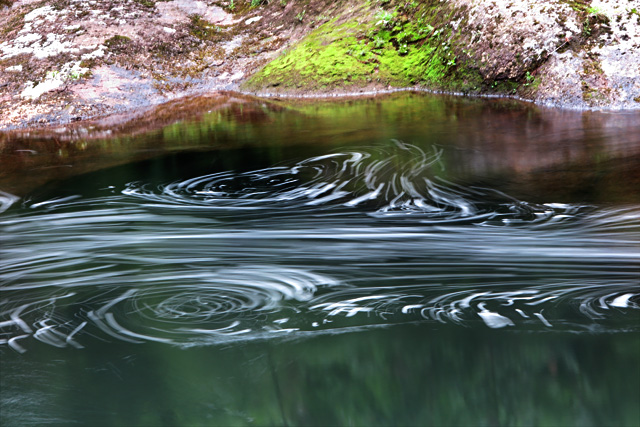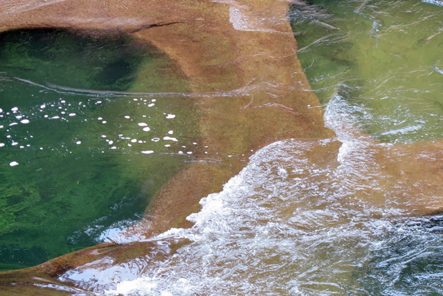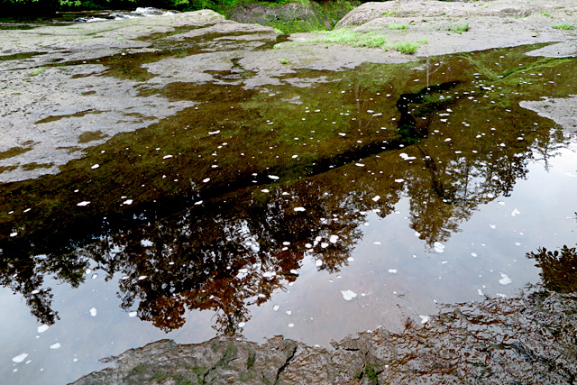 間川底が削られ、いろいろな溝ができており、また、石に掘られた甌穴がいたるところに見られ、さらに一枚岩の滑、滝、緑を写す瀞、更にさらに、どういう理由だろうか、泡立ちやすい