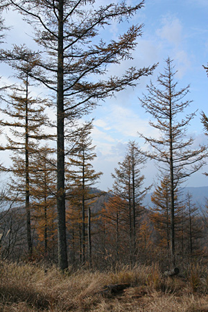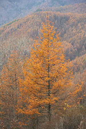 小楢山 ![]() 防火帯の落ち葉の輝き ![]() 山頂の風景 ![]() カラマツの黄葉 水ケ森林道 ![]() 三本のブナの巨樹 ![]() 水ケ森の主、ブナの巨木 ![]() 1412mピークのモミジ ![]() カラマツの黄葉 |