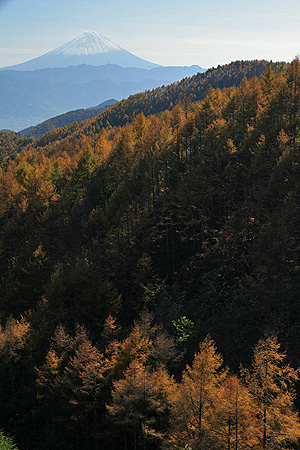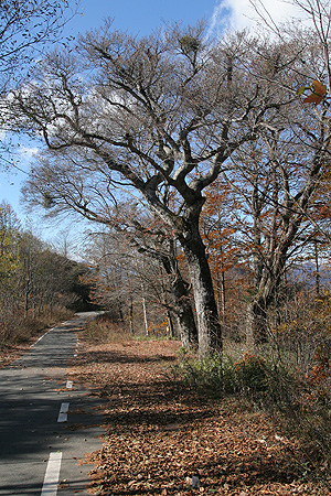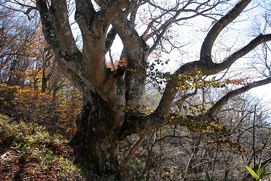 | 小楢山と水ケ森林道のブナの巨木と富士山撮影 ('06-11-07歩く) ( 焼山峠⇔小楢山 ) ここのところ、カラマツの黄葉越しの富士山の写真、それに、松浦隆康著「静かなる尾根歩き」で紹介されていた水ケ森付近の一見の 価値があるというブナの巨木、が気になっていた。 山に登るなら、11/3に登った菰釣山が山頂付近ではもう紅葉がおわりかけていたので、もっと低い山の方が良さそうだと思う。 そんなことを勘案して水が森林道に近い小楢山に登って水が森林道を経て、カラマツの黄葉越しの富士山やブナの巨木を写して戻ってくることにした。 この日の天気予報は発達した低気圧に伴う前線が日本海から太平洋側に抜け、朝のうちは雨だが午後からは晴れ、山梨はさらに早く回復する予報であった。 家を出るときは雨であったが、天気予報を信じて、中央高速相模湖ICへ向う。期待通り笹子トンネルを抜けると、雲はあるものの青空も 見えるお天気で雨は完全に上がっていた。勝沼・塩山ICで降りて、大弛峠の方に向う。 塩平に来ると期間の書いた交通止めの看板が立っている。しかし、ゲートは開いて通行できる。 そのまま行くと、途中舗装工事中の箇所があった。このためだったのか、と思いながらくねくねと上って行くとやがて焼山峠に到着する。焼山峠、以前は広い砂利の駐車スペースであった。今は随分と 変わってトイレもあり、駐車スペースも完全に舗装されている。 子さずけ地蔵も地蔵さんの数が増えている。 周りを見ると、植えられた もみじはもうほとんど散っている。周囲の山もカラマツの黄葉が残っているだけで紅葉はほとんどない。不思議だと思ったが、すぐ納得できた。小楢山(1712m)、先だって登った丹沢の菰釣山(1379m)より、 ずっと低いと思っていたが全く逆であった。以前登って登りが少ないので、低い山かと思っていたら、焼山峠が高いので標高差が少なかったのである。 これでは紅葉も期待できない。山頂からの富士山の眺望でも期待して登ることにする。 防火帯をアップダウンを繰り返しながら登っていく。黄葉したカラマツの先端のあたりに日差しが差して くる。上を仰ぎみるとカラマツの林立が天に伸びて黄色に光り、上に吸い込まれそうである。日差しがサーと差込み、もみじや黄色い葉っぱの残り葉が灯火のように冬枯れの灰色の空間に輝く。 また、時には地に落ちたもみじが斜光を受けて最後の輝きを放っている。そんな光景を写しながら防火帯を1時間も登ると、小笹の山道となり、左に小楢山を見て巻きながら上って行く。 10分も笹とカラマツ林の山道を行くと、コナラ・ミズナラの自然林の山道となり、同じく巻きながら行く。そして小さな沢の一杯水というところに至り、そこから左上に登る。 少し登ると白樺が増えてきて傾斜も緩み、初夏にはレンゲツツジの咲く錫杖ケ原の小楢山山頂に達した。錫杖ケ原はすっかりさみしい冬枯れのモノトーンの世界であるが、周囲の白樺の白い木肌の林立が 錫杖ケ原に営みのあることを知らせてくれる。 南側の展望箇所から富士山方向を眺めながら小休止する。青空に雲が流れ、今にも富士山が顔を出しそうであるが、富士山付近に限って雲が切れない。 そのうち他の方角も雲が多くなる。あきらめて戻ることにする。帰りは小楢峠を径由して一杯水に至り、防火帯を戻ってきた。 防火帯ではとうとう雨が落ちてきた。予報では前線の後に寒波が南下してきているようで北日本の高山は雪ということであった。焼山峠に着くと雨はとうとうみぞれになった。 そして思いがけないことに塩山に戻る林道のゲートが閉まっていた。よ〜く看板を見ると9:00〜12:00,13:00〜16:00交通止めとある。たまたま今回は 一度通ったことのある水が森林道を帰るので支障はないが、バイパスの林道を知らない人は戸惑ってしまうだろうと思いながら帰り支度をする。 ( 水ケ森林道のブナの巨木と富士山撮影 ) みぞれの中の水ケ森林道を行く。松浦隆康著「静かなる尾根歩き」によると、水ケ森林道近くには *三本の巨樹と石祠*一見の価値があるブナの巨木 があるということである。前者は林道脇にあってすぐ見つかった。なかなか格好のよいブナである。この頃になるとみぞれも上がり、写真も支障なく写せた。 次は「一見の価値のあるブナの巨木」である。林道脇でなく、尾根に立っているようである。水ケ森林道はずっと同じ様な風景で今どこを走っているか分からない。巨木の立つ1412mのピーク尾根の目印は一ッ木・水ケ森林道が左に分岐しているあたりと 見当付けてゆく。 林道の分岐を見つけ、Uターンして尾根の起点あたりまで行き、またUターンして右側の尾根を注意深く見てゆく。 そうしたところ、四方八方に広げた大きな枝が尾根の裏側からはみ出ているのが見える。あれに違いないと、車を路肩に置いて尾根に上って行く。 ありました、ありました、水ケ森の主のような巨木でした。丁度昼になったので、巨木の下で昼食を取った。その