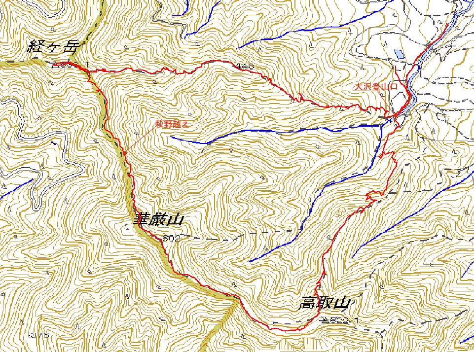 大沢登山口9;31--448mピーク上450m付近10;47〜11;00--主尾根11;34--経ヶ岳11;39〜51--萩野越え12;17--華巌山12;45〜55--