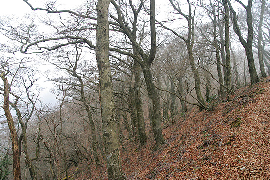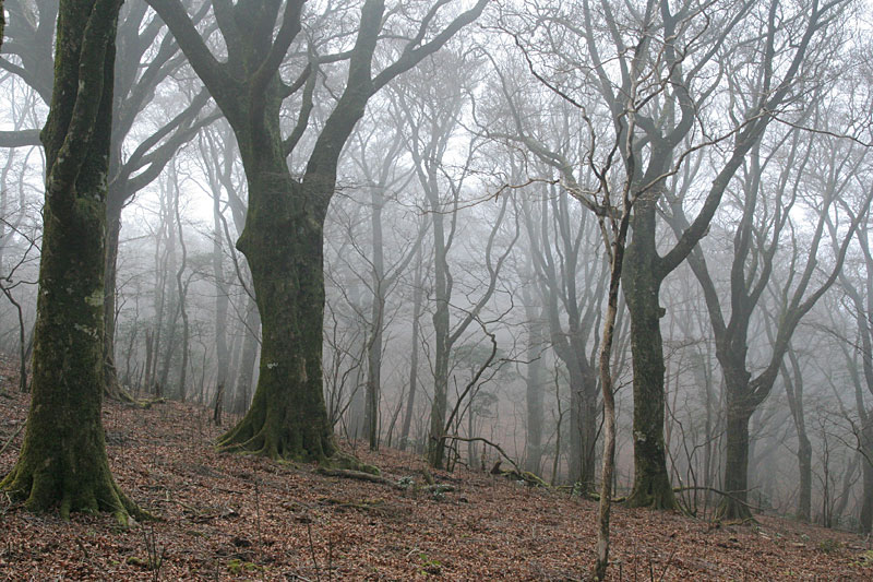 | 旧天城峠を経て三蓋山からツゲ峠 ('06-12-03歩く) 今年の三月に伊豆の仁科峠から猫越岳を経てツゲ峠まで歩いた。その時見た ツゲ峠のブナの朽ちた立ち木の荒涼とした風景がずっと頭から離れない。もう一度見てみたいと思っていた。 今回、12月にも入り、紅葉が残っているなら伊豆の山と思い、まだ登っていないブナが多いという三蓋山の登山もかねて行ってみることにした。 どこから稜線に登るか、滑沢渓谷、大川端キャンプ場、天城トンネルの三箇所が考えられる。滑沢渓谷からの山道は昨年歩いてみて荒れていてダメ、天城トンネルは 距離的に長い、結局、大川端キャンプ場から旧天城峠を経て登ることにした。この場合、問題は車をどこに置くかである。昭文社の地図を見ても、 大川端キャンプ場付近には駐車場は載っていない。しかし、キャンプ場なんで、どこか停められるであろうと、出発する。 自宅から二時間くらいで、大川端キャンプ場入口に着く。 しかし、予想に反して、キヤンプ場林道入口にロープが張られていて進入禁止になっている。幸い、傍のバス停付近の 路肩が広くなっていて2,3台は停められるようなので、そこに車を置くことにする。 キャンプ場へ林道を入ってゆく。周りには紅葉はまだ残っているが、何処も今年は よくないようでさえない。やがて林道はYの字に分岐している。左側には踊り子歩道という標識が立っているので右側の方に行く。 すると「二本杉(旧天城峠)」方面の道標が現われる。やがて、道は山道となり、沢沿いの薄暗い杉の植林帯を行く。7,8分ゆくと目の上に林道が現われ、一旦林道に上がり、左に進む。 50m も行くと、橋の手前で林道と別れ、右手の樹林帯へと緩やかに上って行く。左下にわさび畑を見ながら進むと、沢にかかる橋を渡って沢の右岸を登って行く。 そして、しばらく行くと旧下田街道の標識が現れ、山道は左に折り返すように斜面を登って行く。旧下田街道は「明治38年(1905年)の旧天城トンネルが開通されるまで、多くの 人が行き交った天城越えの道で、ハリス、吉田松蔭も歩いた」とか。 期待して登って行くが、旧天城峠まで杉や桧の植林帯の薄暗い山道で、石仏や石畳など昔の面影はない。 1時間ほど我慢の登りを消化すると、ようやく道標と東屋、二本の杉の大木の立つ旧天城峠に着く。この街道は廃止になってから101年、昔の面影が残るものとすると、この二本の杉の古木かもしれない。 傍に行ってしげしげと見あげる。ハリスが、吉田松蔭が、眺めたかもしれないと思うと感慨深いものがある。 小休止した後、右側の滑沢峠方面へ進む。ここからはほとんど尾根の平坦路で助かる。しかし、天城らしいアセビのトンネルなどのある尾根かと思ったら、 杉や桧の林に照葉樹の潅木が混じる山道で、特に見るべきものはない。三蓋山・ツゲ峠に行くためのアプローチと割り切って黙々と歩く。30分 近く歩いてようやく滑沢峠近くになると杉や桧の林にブナがポツンポツンと点在するようになり、ブナの山に近づきつつある予感がする。 そして、右側が急に開けてブナの大木がところどころに立つ滑沢峠に到着する。 ここよりヒメシャラ、アセビなど潅木に時々ブナの混じる前より明るい 道となる。そして10分ほど廻りこみながら行くと、冬枯れの木々の間から右手前方に三蓋山が見えてくる。ガスに見え隠れする遥か上の三蓋山の稜線にはおびただしい 林立がシルエットで見られ、あれを登るのかと少しビビルが、ブナの林立が見られると思うとわくわくしてくる。 廻りこみながら行くと左手に見えるブナの大木の多い尾根の稜線はV字の鞍部となり、ブナの巨木の曲がりくねった枝が鞍部の稜線からはみ出している。 ブナの斜面を右に廻りこみ、さらに左に廻りこむと、木段が現われ、いよいよ登りに差し掛かる。 木段を登るとグリーン文字の山稜線歩道標識が立ち、Uターンするように左上へと急木段が続いている。木段の周りはアセビ、ヒメシャラ、ブナが 多くなる。本コース一番の急登である。段差が大きくまともに登れない木段を脇に避けたりしながらあえぎあえぎ10分も登ると勾配が 緩み、待望のブナ林の山道を行くようになる。 広大な面積のブナ林である。巨木は少ないが、丹沢の堂平より広いブナ林と思われる。 おぉ〜、すごいなぁ〜、と思いながら進んでゆくと、ガスが流れてきて幻想的な風景になる。もう、この機会を逃してはならないと、 気の趣くままに写す。こんな時、写真の結果は気にならず写していることが本当に幸せと感じる。 そうこうしながら進むと、ブナ林の中に ベンチと標識のある三蓋山(みかさやま)山頂に達する。尾根が左方向に伸び、さらにブナの林立が続いているのが見える。ツゲ峠へは道標と踏み跡によると右斜めの方向に 緩やかに下っている。写真を写しながら休んでいたので、山頂周りは帰りに偵察することにして、すぐツゲ峠の方に向う。先ほどのガスは切れて、ツタが絡み合ったり、枝が