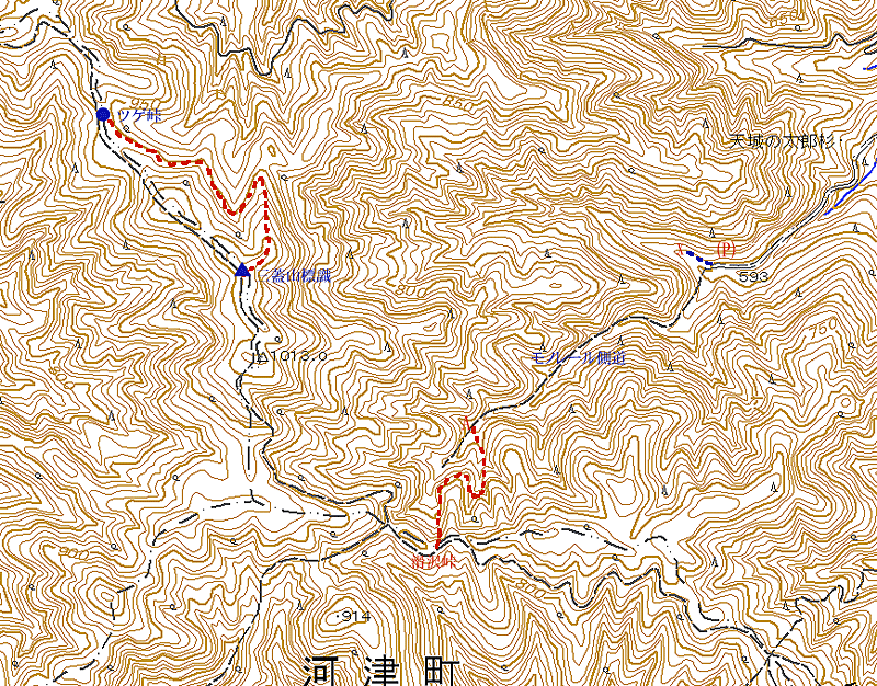 滑沢を経て三蓋山からツゲ峠 ('06-12-13歩く) 12/13、以前試みて撤退した滑沢のコースを歩いてみた。 414号線の滑沢渓谷バス停から滑沢沿いに伸びる林道がある。そこを道なりに林道終点まで行く。終点に車を置いて出発する。しかし、滑沢峠への 道標はない。以前は真っ直ぐ沢を進んで失敗した。今回は、天城をよく歩かれているkawaさんに、左のワサビ栽培作業用のモノレールの軌道が敷設されている沢をモノレール側道沿いに行くとよい、と 聞いていたので、林道沿いの左の沢を一旦渡って、それからモノレールが敷設されている沢を登って行く。 こんなに奥までよくワサビを栽培するものだ、と思いながら 石がゴロゴロし、ところどころ沢の水が溢れ流れている側道を延々と行く。約30分ほど登ると、「滑沢峠」(A)の道標が出てきて左の沢に登って行く。 すぐ沢は二股に分かれ、右の沢沿いに登って行く。4,5分も行くとこの沢を渡り右の尾根を巻きながら裏側に行き、下にモノレールの敷設されていた沢を見ながら上って行く。 源流に近づいてくると勾配もきつくなり、ブナの大木の茂る斜面をジグザクと上って行く。そうするとやがて見覚えのある滑沢峠に到着する。 道標(A)から約20分くらいである。車を置いたところからは50分である。 今回、登って分かったことが二つある。一つは三蓋山の標識のあるところと三等三角点のある位置との違いである。 それから、三蓋山からツゲ峠までの山稜線歩道の推定ルートである。 山道にあった三蓋山の標識は、 下の地形図のように、三等三角点の先のところにある。三等三角点は山道にはなく、山道から20m〜30m離れた東側のピークにあった。三蓋山標識からツゲ峠への山稜線歩道は、推定で厳密ではないが、地形図の破線ではなく、 右斜めに一旦下り、それから左に巻いていく赤破線(下の地形図)のルートに変更になっている。 |
