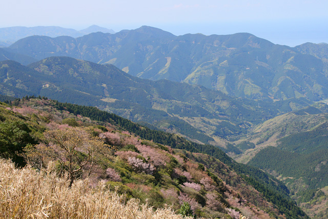 ミソウ台・魂ノ山('10-04-25歩く) マメザクラの咲く頃の西伊豆スカイラインはすばらしい。これがあの西伊豆スカイラインかと、目を疑うようなピンクのマメザクラ、アセビの花、木々の微妙な色合いの新緑の塊りが