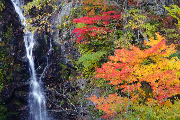 掛けられているので、行ってみる。先ほどの山肌とは違い紅葉真っ盛りで(上の写真)、白い滝の流れとのコントラストが美しい。