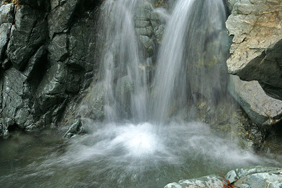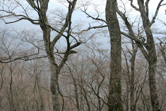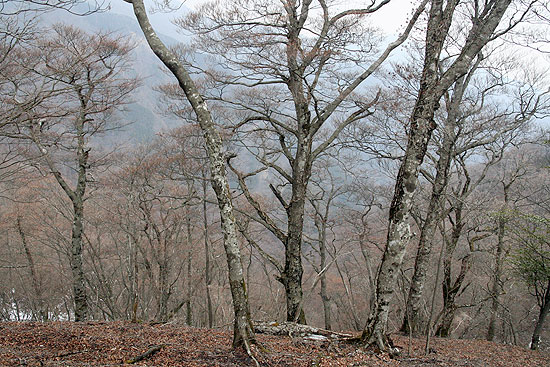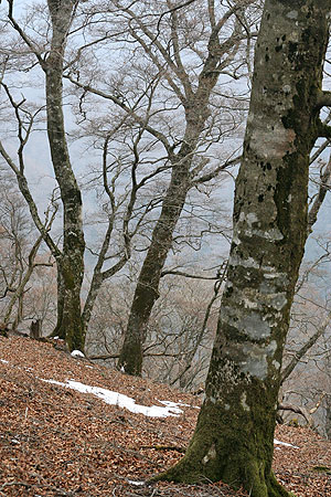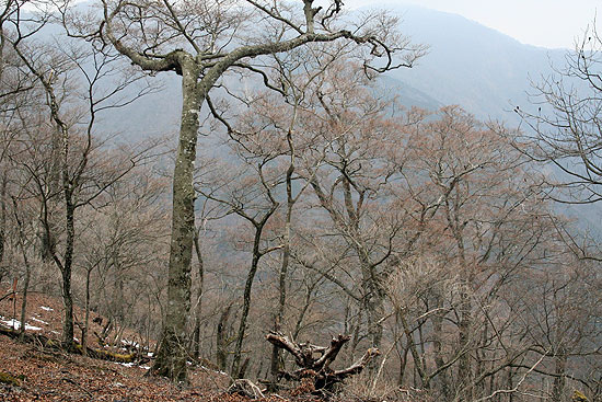 〜 札掛を基点に長尾尾根から境沢 〜 ![]() 長尾尾根のブナ林 長尾尾根〜境沢(06-02-23歩く) この日のお天気はあまり期待していなかったが、朝ゆっくり起きたところ、そのうち日差しがでてきたので、どこか近場の山でも歩いてみようと思い立つ。以前、友人に教えていただいた長尾尾根のブナ林でも見に行くことにする。 急に思い立ったので、連れは「これからわたしが準備したら遅くなる、一人で行ったら」と言う。そんなことで単独行となる。 まだ、残雪が多いかもしれないと軽アイゼンとスパッをザックに放り込んで出発する。自宅を出たのは8:30ころである。 途中のコンビニで食料を調達して蓑毛からヤビツ峠を経て宮が瀬に通じる県道70号線を上っていく。菜の花台では、富士山が靄で薄っすらと 浮かび、真冬の姿とは違って見える。また、ヤシャブシの花房やフサザクラのつぼみもだいぶ大きくなり、そろそろ山も芽吹きの時期を迎えようとしているようである。 ヤビツ峠、丹沢の名水の傍を通り、札掛の駐車場に向う。 札掛の駐車場に着いたのは10:10である。日は長くなったというものの、17:00時ころには暗くなる。新大日までに行くのを目標とするが、 午後14:00まで登って引き返すか、周回のルートである境沢に降りて戻ってくることにする。駐車場の傍から杉林に上って行く。 ずいぶん昔、長尾尾根に向ったことがあった。その時は植林された杉の薄暗い山道が延々と続き、いやになって戻ってきたことがあった。友人にブナ林があると聞いて 信じられない思いであった。 予想に反して、杉はよく手入れされていて、明るくその林立が美しい。20分もジグザクと杉林を登ると、もう一本の札掛丹沢ホームからの道と合わさり、道は右に廻り込みながら緩やかに 上って行く。途中、時々開け、丹沢三峰山が見える。やがて大洞・考証林入口の道標の立つ分岐に達する。ここを新大日へ左に廻り込みながら行く。右手には昨年歩いた雨量観測所付近から続く 黒木が目立つ尾根が見える。15分ほど行くと見覚えのある道標の立つ塔ノ岳・キュウハ沢分岐となり、塔ノ岳2:40とある。そして正面には上の丸らしきピークが立ちはだかっている。 正面の塔ノ岳方面に上っていく。道は割合若い杉の植林地を右斜めに登りながら入ってゆく。若い植林地を抜けるとモミの大木の混じる 明るい杉林となり、道は左に折り返し登って行く。そして上の丸の主のようなモミの大木の立つミズナラなどの明るい斜面を右に 見ながら回り込んで行き、上の丸の裏側に回り込む。正面には塔ノ岳への二の塔、三の塔あたりの表尾根が見える。そして、また 杉林に入り抜けると、完全に上の丸をかわし、尾根に乗る。 若千下った後に登りとなる。そろそろ芽吹きの時とはいえ右から吹き上げる 風は冷たく、手がかじかんでしまいそうである。梢の間からは丹沢山の三峰が見え、懐かしい。大まかに言って、右側が雑木林で左が杉林の道を登って行く。真正面にピークが見え、それに向って 登るのかと思ったら、右手に鹿除けのフエンスの赤テープのぶら下がった網戸が現われ、それをくぐって右斜めに杉林を登って行く。そして途中から左に折り返し、また網戸をくぐり、 尾根に戻る。先ほどのピークが昭文社地図「丹沢」の1004mのピークと思われる。 雪の残った杉の疎林の道を先ほどの網戸出口から15分ほど登ると、傾斜もゆるみ、左側が杉林で、右側がブナ林か、と思われるような自然林の綺麗な明るい道となる。さらに7分ほど明るい尾根道を登ると 待望のブナが現われ、直ぐ上にピークが見える。大体1100mの地点ではないかと思われる。ここから写真を写し写し行く( そのためブナ林の始まりから道標のある札掛(境沢)分岐までの下記のコースタイムは 全くあてになりません。) 。 すばらしいブナ林である。 この厳しい環境で、良くぞ残っていてくれたと思う。丹沢山の堂平に比べて平坦な場所のブナ林の面積は少ないが、約1100mの標高のあたりから新大日の直下まで尾根に沿っておおよそ1.0kmにわたって続いている 規模の大きいブナ林であった。 写真を写し写しし、札掛(境沢)分岐に着いたのは13:51である。もうタイムリミットである。新大日の方に10分ほど進み、ブナの様子を 見る。ブナは少なくなったようなので、境沢ルートで下ることにして戻ることにする。境沢までは道が荒れていて、しかも急降下、慎重に下る。 約50分ほど下ると沢の音が聞こえ、小さな滝が見えてきて境沢に降り立つ。すぐ林道かと思ったら、それから沢下りであった。沢を、何回となく横切たり、高く巻いたりする鎖場もあるルートで、 林道終点の境沢出合まで、滝や渓流の写真を写して道草もしたが、実に1時間15分もかかった。 林道終点ではお天気のせいもあり、少し暗くなってきた。さらに林道を50分ほど下ると、丹沢ホームの明かりが見えてきて、ようやく着いたかとホッとする。帰り、丹沢の名水「護摩屋敷の水」をポリタンクに汲み、家へのお土
