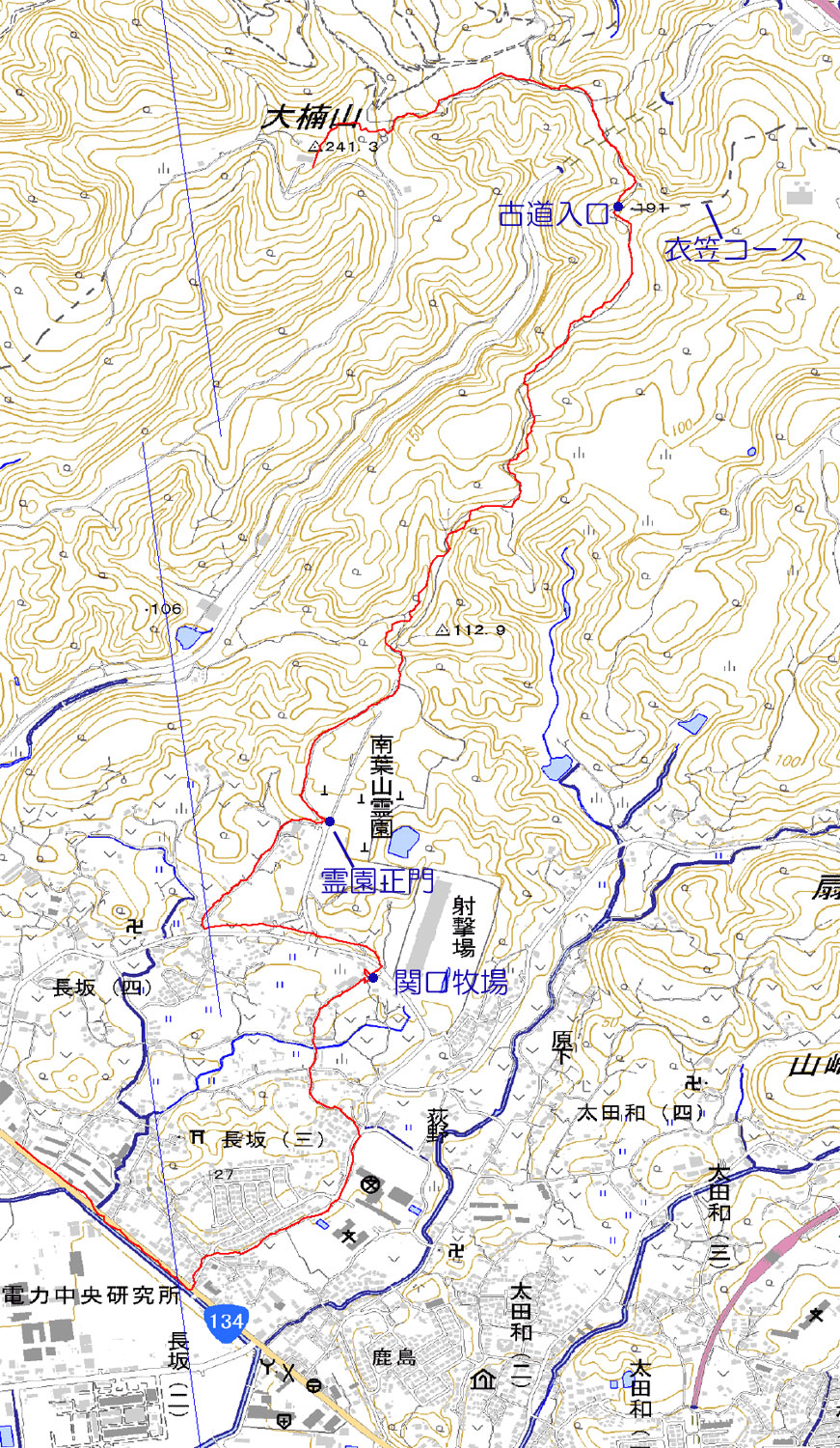 ---古道標柱(南葉山霊園裏)13:10---関口牧場13:32〜49---長坂バス停14:08
