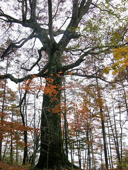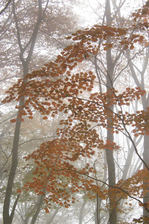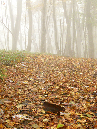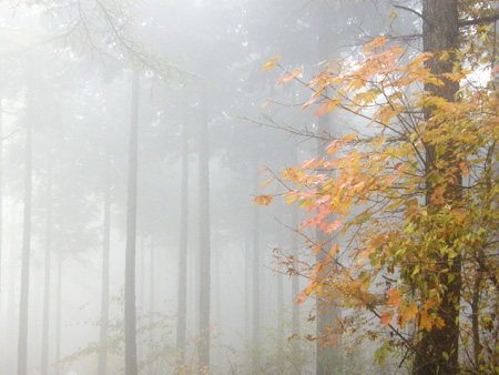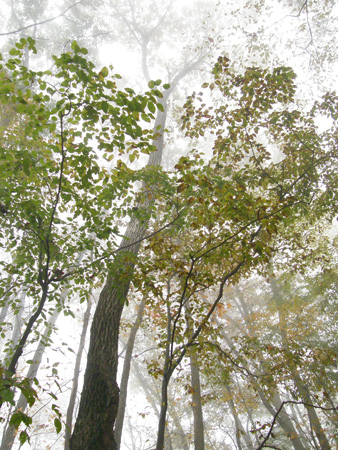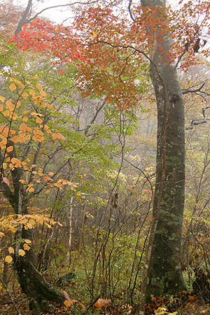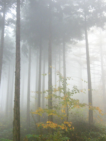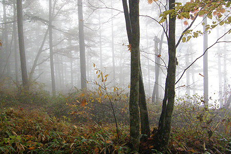| 松姫峠を基点に奈良倉山・鶴寝山を歩く ('07-11-07) 同級生3人での恒例のハイキングである。 最初に歩いた山は、やはり松姫峠からの大マトイ山であった。お互い定年になって暇ができた。季節のよいときハイキングでもしようかと始めてもう5年になる。 松姫峠付近も変わったものである。峠には駐車場ができて、立派なトイレも建っている。葛野川揚水発電用ダムも完成し、満々と水を湛えている。 今回はまだ歩いていない秀麗富岳12景の奈良倉山に行くことで計画した。 天気予報では穏やかに晴れるということであったが、葛野川ダムの上あたりからガスりだし、松姫峠は霧の中である。 松姫峠から奈良倉山までほとんど霧の中であった。山頂に上って45分ほど早い昼食を取ったりして時間稼ぎをしたが、とうとう富士山は 顔を出さなかった。しかし、霧に煙る・・・、落ち葉の山道、山道のトンネルのような木立ち、カラマツや雑木林のシルエット、 しっとりした紅葉、巨木などなど、霧がなかなかすばらしい演出をしてくれた。 ![]()