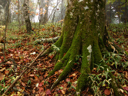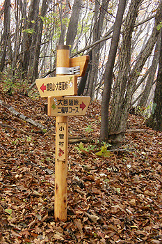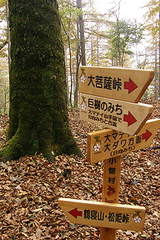 友人の住んでいる八王子で反省会をやるにしても、まだ早い。ついでに鶴寝山往復をしてみることにした。大マトイ山へ の道は、以前、鶴寝山を迂回していたが、2,3年前、巨樹のみちということで鶴寝山を通るコースができたと聞いている。鶴寝山迂回の分岐点に着くと、 小菅村で作ったのだろうか、立派な白木の道標が立っている。以前の道は 二輪草コースとなっていた。 ややきつい真っすぐの山道を登ると、やがてやはり白木の標識とベンチのある鶴寝山についた。 南側が切り開かれており、 展望がきくが生憎の霧。松姫峠でも晴れていると富士山が見えるので、もしかして晴れていたら富士山が見えるかもしれない、残念。 その先が 巨樹のみちとあるので巨樹を見るために下って行ってみた。モミジを従えた立派な巨樹(上の写真)が立っていた。そこから巨樹が次々と現れる。 大分下った。二輪草コースが合わさっていたらそちらから帰ろうかと思って行くがない。そのうち日向みち・巨樹のみち分岐に到着。 その先の巨樹のみちを偵察してみたがやはり二輪草コースはない。これ以上行くと遅くなるので引き返すことで恒例のハイキングを終えることにした。 ところで遊歩道のように立派に作られた日向みちとはなんであろう、大マトイ山の手前で、巨樹のみちと合わさるとあるが気になった。 今回はコンデジしか持っていかなかったので、いつか巨木の写真撮影を兼ねて日向みちを歩いて見たいと思っている。 (地図) ・昭文社 山と高原地図「大菩薩嶺」 (コースタイム) 松姫峠(P)9:15--奈良倉山10:32〜11:17--松姫峠12:25--二輪草のみち分岐12:44--鶴寝山13:00〜13:08--日向みち分岐13:23〜32--鶴寝山13:40-- 松姫峠(P)14:00 |
