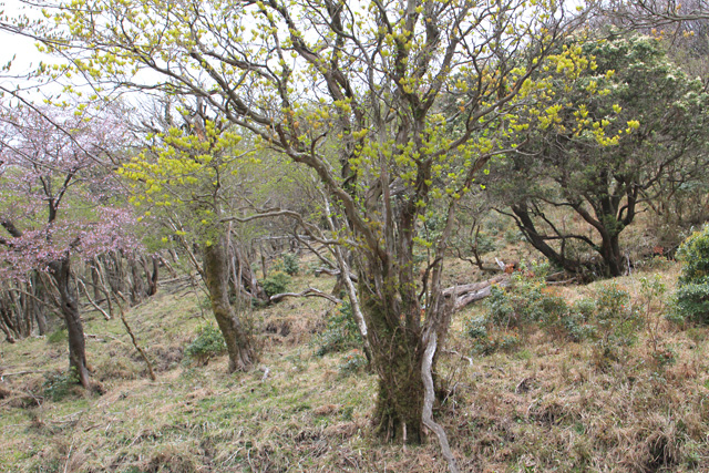 | 後藤山と展望台鞍部付近にて、木々の芽吹きとマメザクラ | |