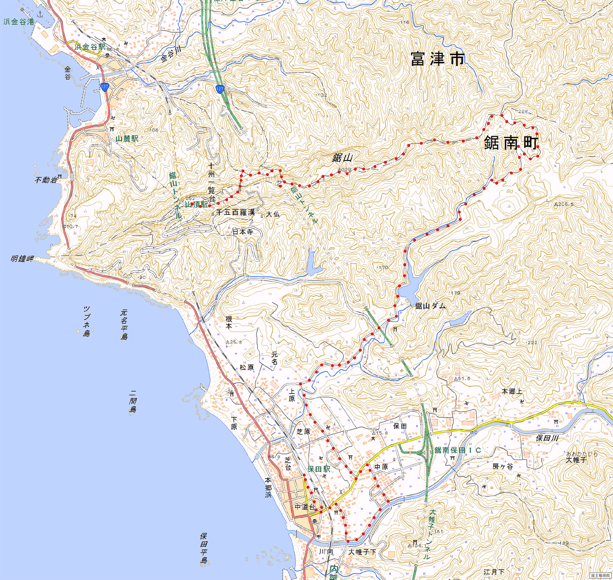 林道口13:06---鋸山ダム13:54---高速道高架橋下14:01---保田川天王橋14:38---保田駅15:00