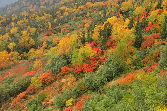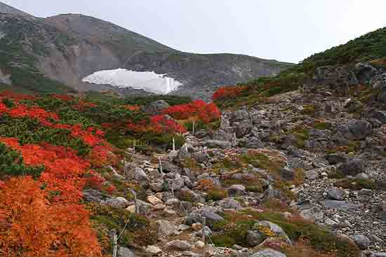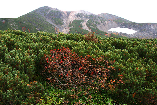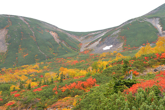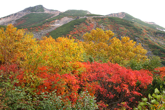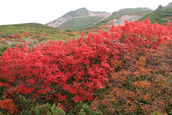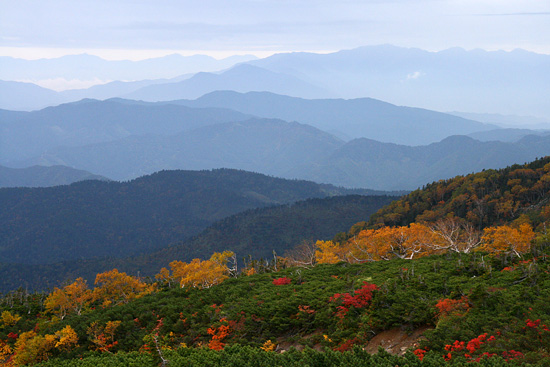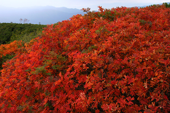 約1.5時間の撮影しながらのハイキングであった。紅葉真盛りで、紅葉のパッチワークのような山肌、紅葉の向こうの山並み、ナナカマドの紅葉、黒木と紅葉のコントラスト、足元の草花や草紅葉、