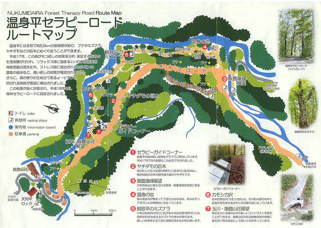 113号線からここまで約30分である。 そこには温身平の遊歩道の案内板があり、温身平セラピー基地の起点となっている。今日中に神奈川の自宅に帰るので、約1時間くらい歩くことにして、下に掲載のパンフレットの