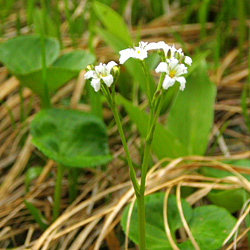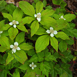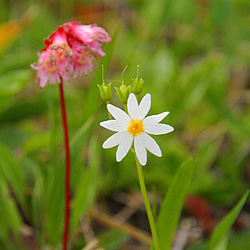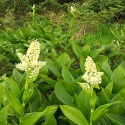 草原にはイワカガミ、ヒナザクラ、ハクサンチドリ、ゴゼンタチバナ、イワイチョウが咲いている。草原を過ぎた潅木の道にはシラネアオイも咲いていた。草原と潅木の道を繰り返して