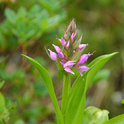 途中、アカモノやムシトリスミレが群生している。やがて黒湯からの山道と合流し、次に乳頭山独特の断崖の山頂が見えてくると、