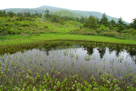 そして池塘(ちとう)が現われ、イワイチョウが群生し、池にはシラビソが写り込み、静かなただずまいを見せている。