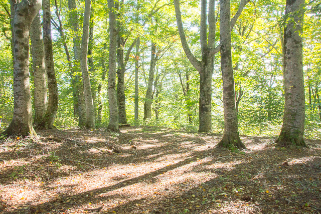 添付のmapの青少年野外活動センター(map-P)に車を置いて裏のブナ林散策コースに右回りで入ってゆく。ブナの高木の林立が素晴らしい。斜光に影を落とし、静かに