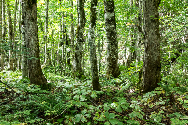 青空をバックに逆光に輝き美しい。正面にブナの森が連なり、その林縁に向かって左に行くと、ひょこりと林道に出る(map-B)。