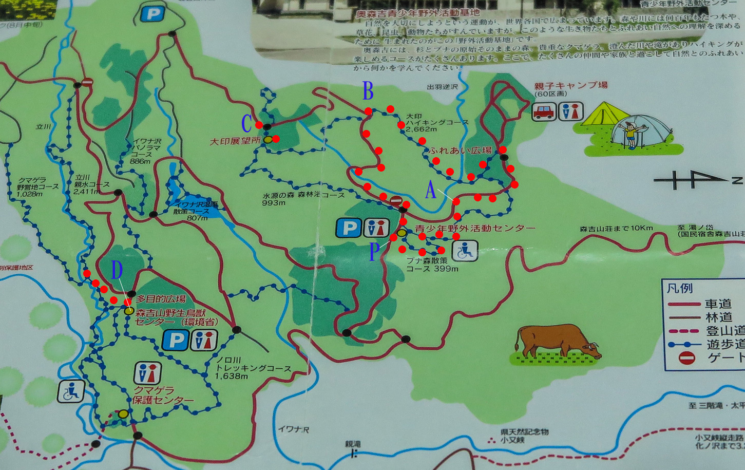 (コースタイム) ブナ林散策コース入口8:07---親子キヤンプ場分岐8:28---林道(map-A)8:42---親子キヤンプ場入口8:52〜58