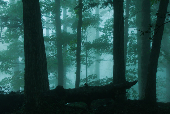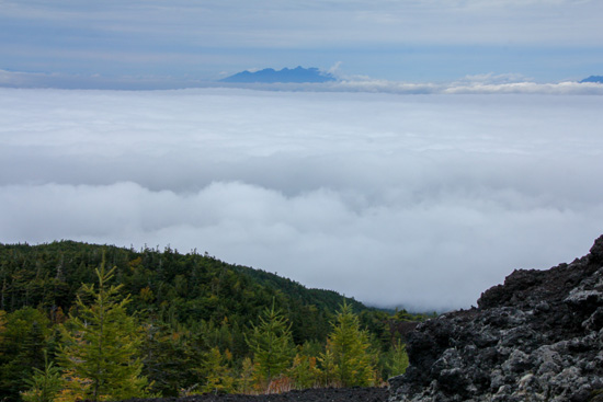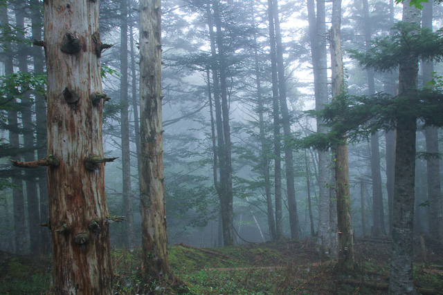 スバルラインの料金所あたりから霧の中となり、シラビソなどの高木のあるところで幻想の森を撮影した。その後、4合目あたりで霧から抜け、