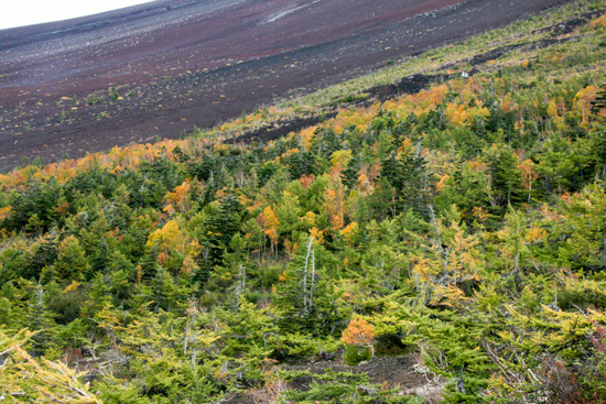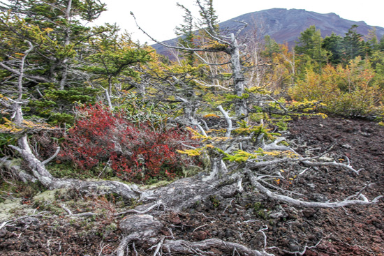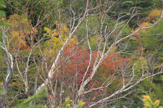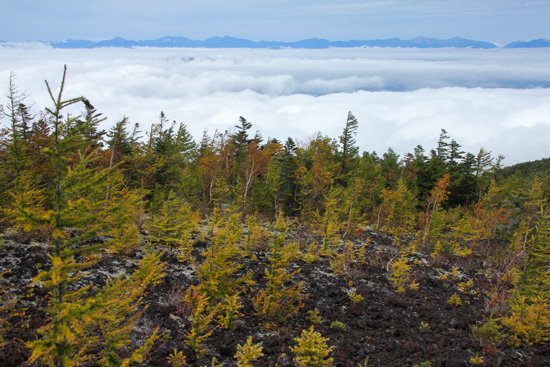 だんだんきつくなる石畳みの道を登ってゆくと、森を抜け、ダケカンバの紅葉、盆栽のようなカラマツの古木等が見られるようになる。カラマツの下にはコケモモが赤い実を付けており、摘んでみると甘酸っぱくておいしい。