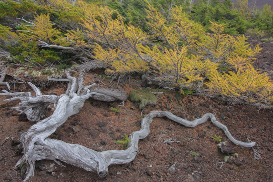 最後はカラマツの古木のオブジエの観賞会となってスバルラインに降りる。そこからの退屈な車道歩きは意外に短かく、10分ほどで奥庭の駐車場に着いた。