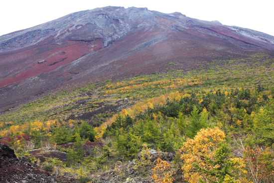 やがて、水平道のお中道に至る。右に大沢崩れへの道を見送り、左の方にカラマツの古木の疎林の道を行く。右正面に富士山を仰ぎ見ると、森林限界下斜面のカラマツやダケカンバの黄葉模様が美しい。