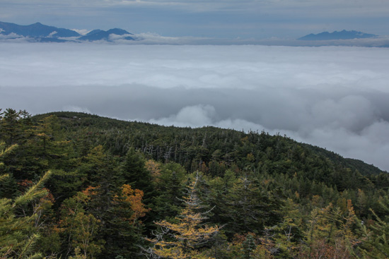 眼下に雲海を見渡す幸運に恵まれ、コースを歩いているあいだ中雲海を見ながらの撮影であった。また、帰り、スカイラインの料金所手前で霧の中に突入して