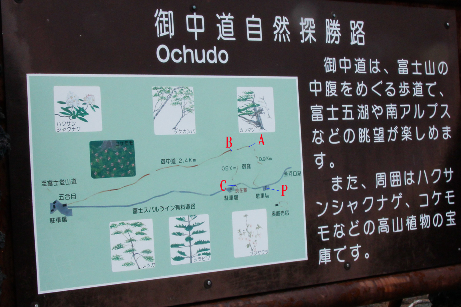 富士山スバルラインの終点手前に御庭、奥庭の駐車場がある。今回は下に添付のmapの奥庭の駐車場Pに車を置いて、御庭をP→A→B→C→Pという順に撮影しながら廻った。