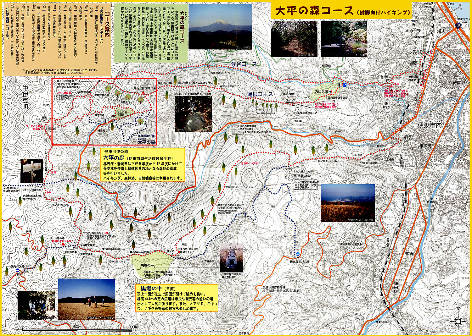 IZU NETで調べたところ、下記のような詳細マップが載っていて、渓谷コースもあった。今回は、渓谷コースを登って尾根コースを降りてくる少し短かいコースを設定した。