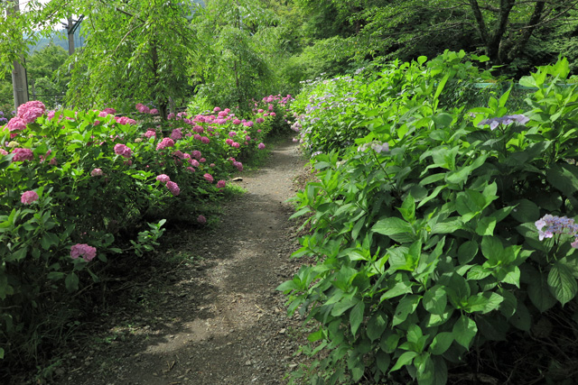 の低い標識があった。あまりきれいな道でなく、こんなところが、と進んでゆくと、見違えるようなあじさいの小径となった。