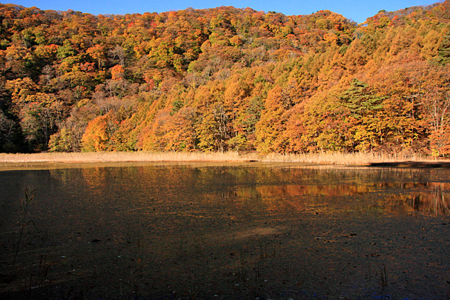 水面にはカラマツの松葉と紅葉したいろいろの木の葉っぱが浮かび造形的な模様を作って美しい。廻りこんで行くと小さな橋があり開け、これから登る紅葉の尾根が水面に映りこみ、静かなたたずまいを見せてくれる。